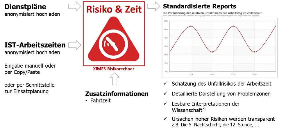 Der XIMES-Risikorechner ist ein webbasiertes Software-Tool, das wissenschaftliche Erkenntnisse in eine leicht überschaubare Risikobewertung Ihrer Arbeitszeiten und Schichtpläne / Dienstpläne überführt.